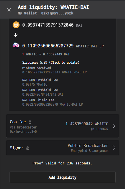 #### 5. Review transaction details closely including RAILGUN protocol fee and click 'Generate proof' to continue