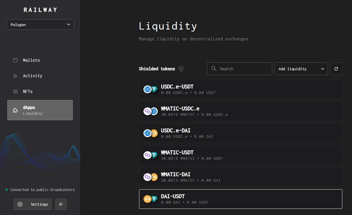 You will need to [shield](https://help.railway.xyz/transactions/shield-unshield) equal proportions of the 2 underlying tokens to enter into LPs.&#x20;