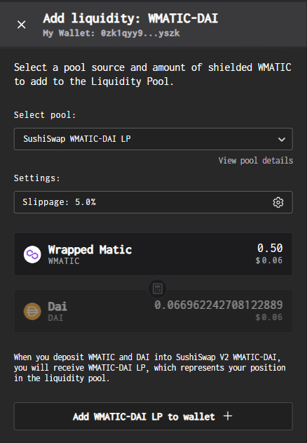 #### 5. Add the resulting LP token to your wallet to view it in your asset list. You will also see the outcome of the liquidity provisioning.