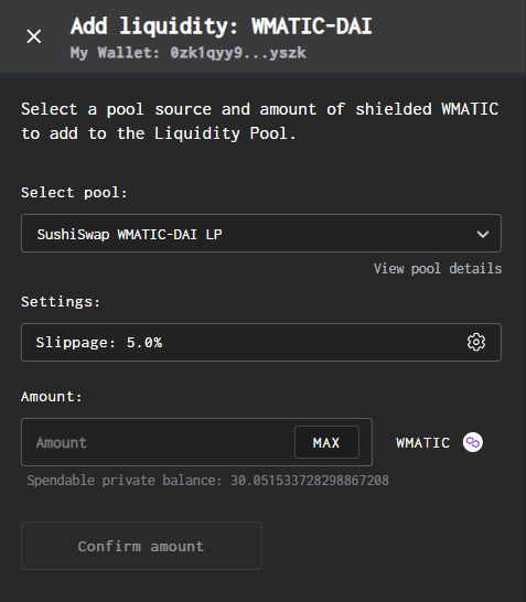 #### 3. Enter in the amount of LP tokens you would like to remove and click 'Confirm amount'. You can also change slippage by clicking the cog.