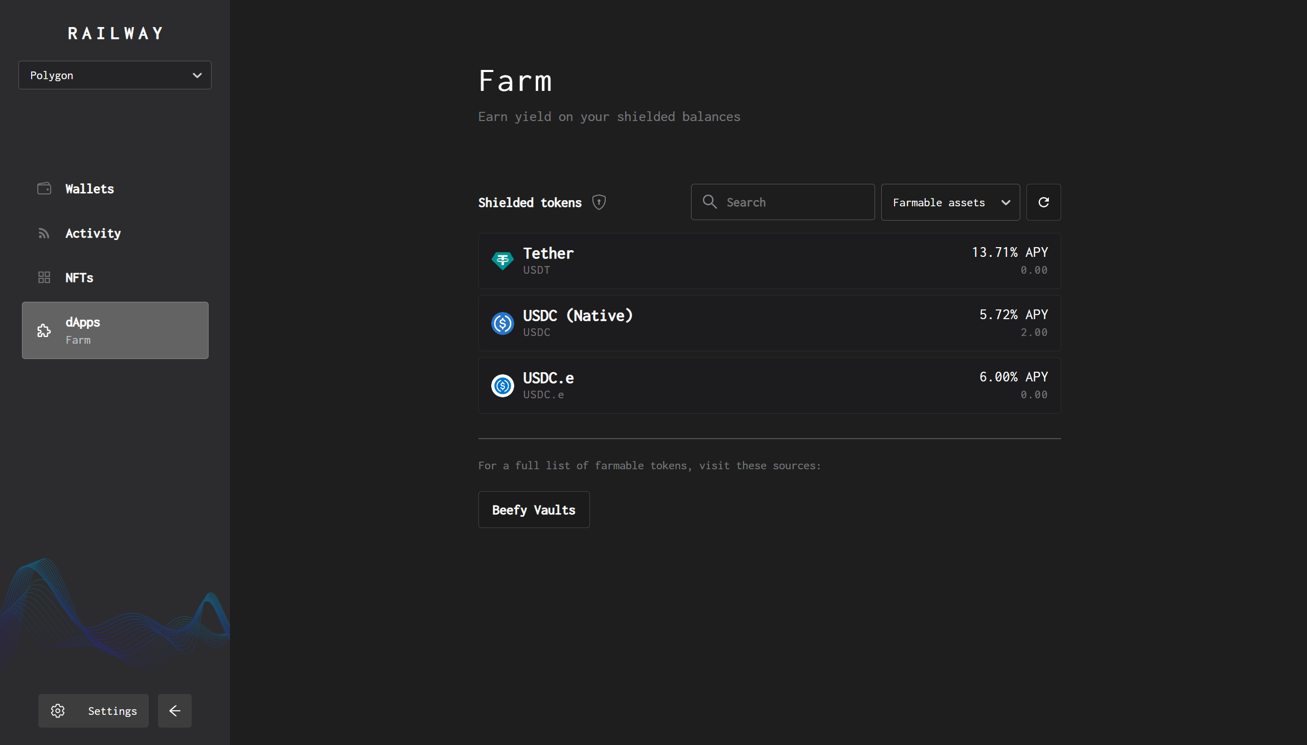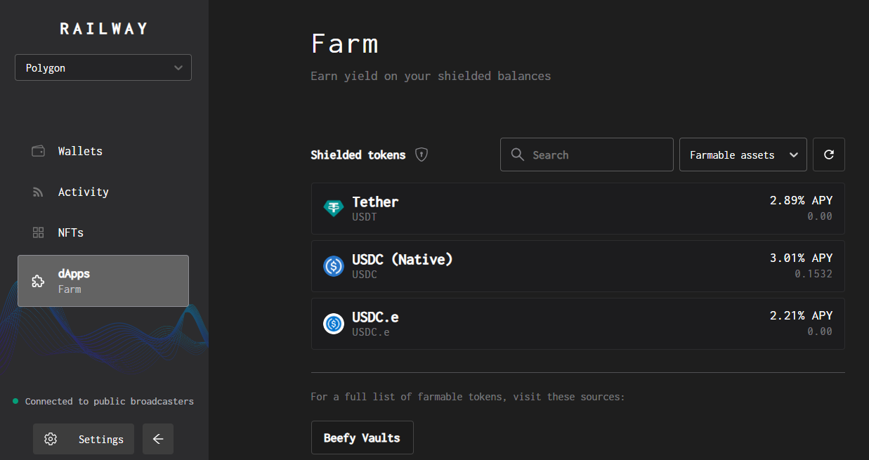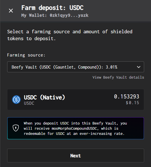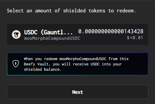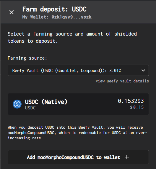 Please note, most Beefy vaults are for farm tokens (such as Liquidity Pool [LP] tokens on a DEX) and rarely support single-sided raw assets like WETH or USDC by themselves. In most cases, you will need to provide liquidity on the underlying DEX or farm first, then shield to proceed with private yield farming.