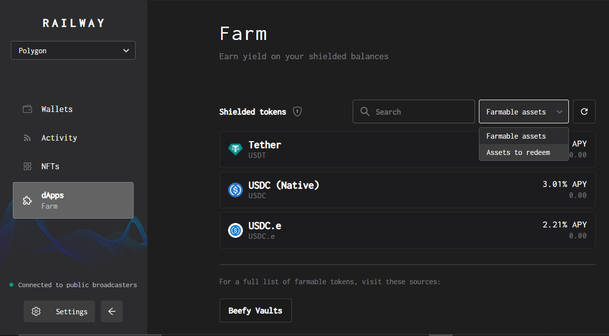 If you already have a shielded farmable asset, then click on the asset in the list. If you do not have a farmable asset, click 'Beefy Vaults' to see the full list and obtain the farm token for the vault you want. You will need to shield a farmable asset such as an LP token to proceed.