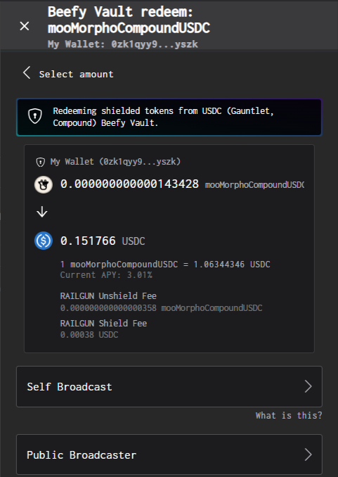Review the withdraw transaction closely. Click 'Redeem from Beefy Vault' to proceed. Select either Public Broadcaster or Self-Broadcast to complete the transaction.