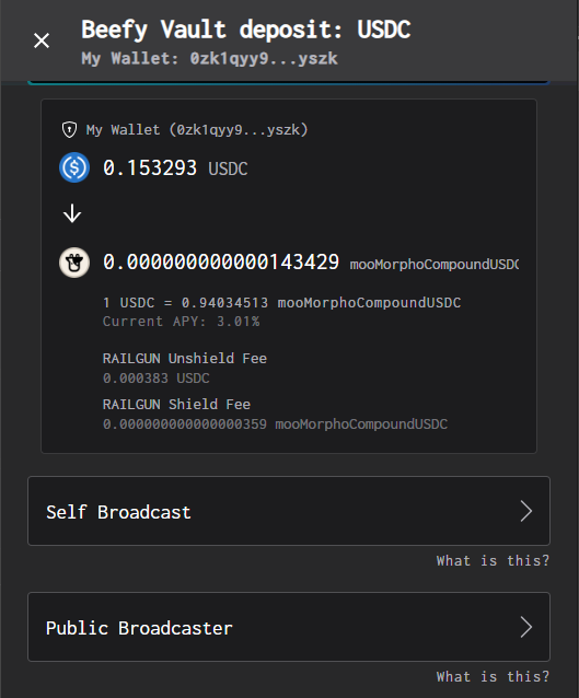 Review the transaction details closely. Click 'Deposit into Beefy Vault' and select either Public Broadcaster or Self-Broadcast to complete the transaction.