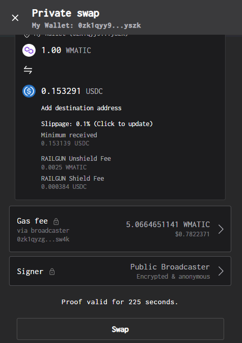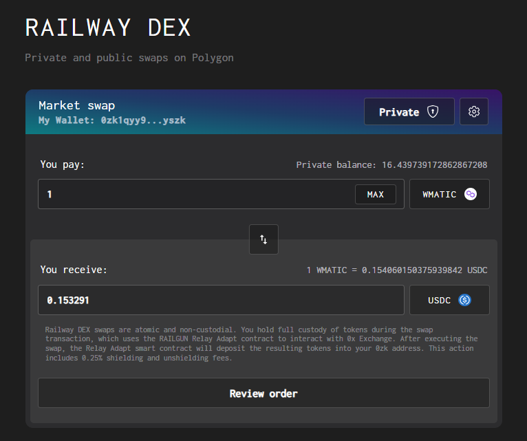 *Railway supports swapping from both 0x and 0zk addresses through Railway DEX. Easily swap any ERC-20 through the* [*0x API*](https://www.0x.org/) *(the same DEX aggregation tool powering Matcha.xyz). Learn more about Railway DEX* [*here*](https://docs.railgun.org/wiki/learn/railway-dex-swaps)*.*