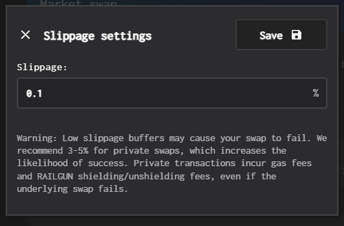 4. By default, slippage is set to 1%. **Drag the slider to set it anywhere between 0.1%-20%. Click "Save" to set slippage.**
